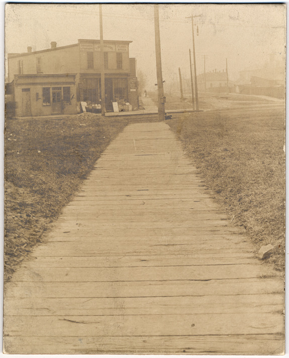 View along wooden sidewalk to clapboard grocery store at corner of cross street. Sign on store reads: T[heodore] Feldman & Sons, groceries & provisions, flour & feed. Buildings beyond. Handwritten on mat back: "March 13th 1903. Margrett Zuelch (?). McDougall Ave. just north of Gratiot Ave. Looking south. There had not been any change in the walk. F.S.Q."