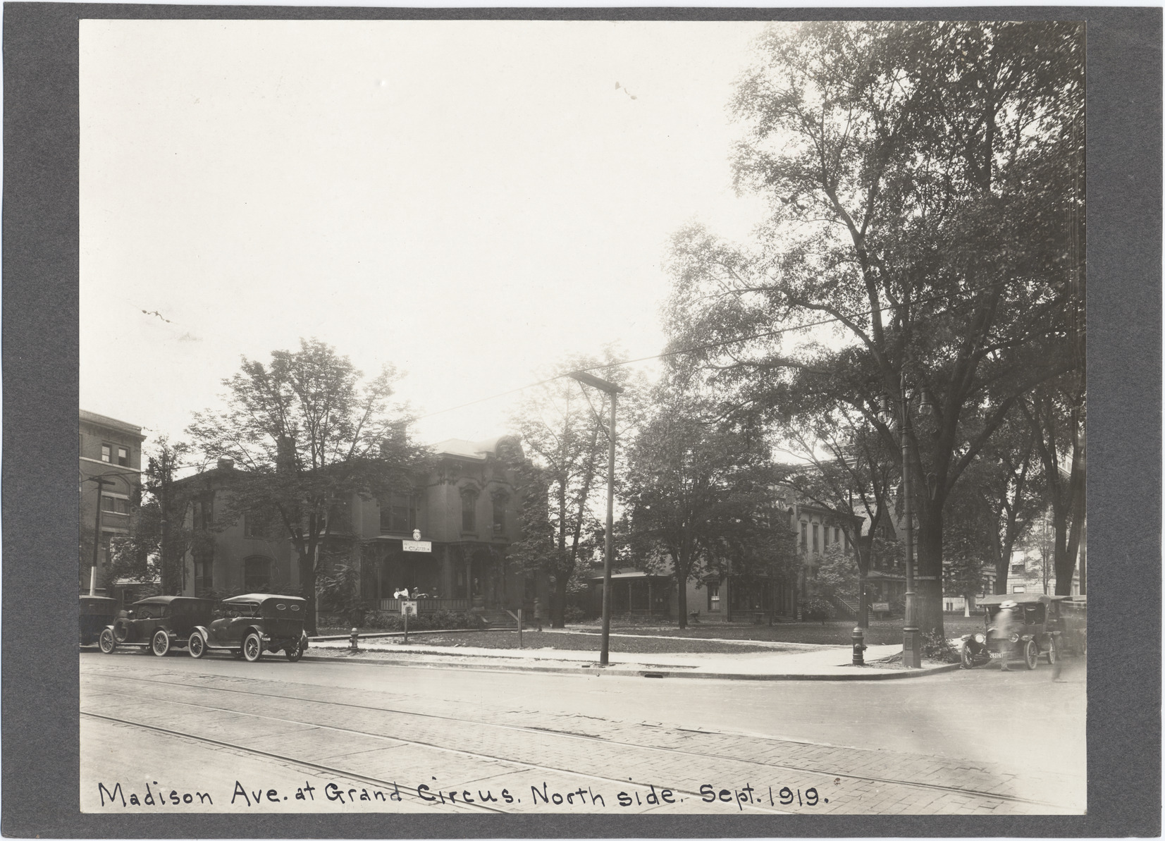 Favorite this☆ Witherell at Madison Ave. Description: Large brick houses along Madison Avenue, as seen from corner of Witherell, cars parked on street. Building on left has sign reading "Army & Navy Club." Handwritten on front: "Madison Ave. & Grand Circus, north side, Sept. 1919." Details Resource ID: DPA4351 Subject: Brick houses--Michigan--Detroit Streets--Michigan--Detroit Automobiles--Michigan--Detroit Photographic prints Date Issued: 1919-09 Format: 1 photographic print mounted on stock ; image 7.5 x 9.5 in. Member of: Burton Historical Collection Filing Location: D/Streets-Madison & Witherell Rights: Physical rights are retained by DPL. Copyright is retained in accordance with U.S. copyright laws.