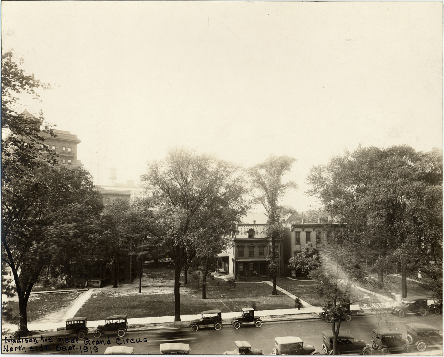 Overhead view of Madison Avenue, showing row of houses with large front yards, sidewalk lining street, many cars parked alongside street. Y.M.C.A. is located behind trees on left side of photo. Handwritten on front: "Madison Ave. near Grand Circus, north side, Sept. 1919." Typed label on back reads: "Madison Ave. near Grand Circus, n.s. Sept. 1919, Y.M.C.A. left background."