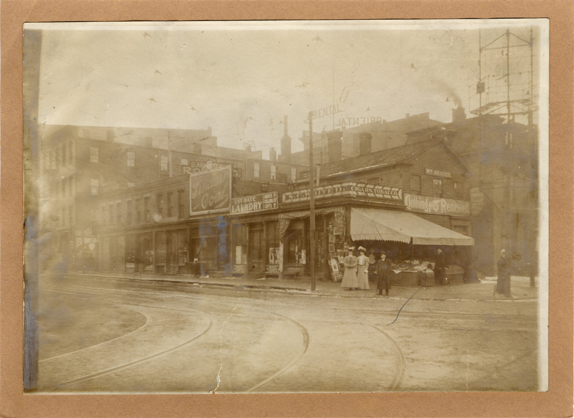 Commercial buildings on Miami Avenue include a laundry and tobacco store. Small group of men and women pose on sidewalk. Handwritten on back: "Miami & north of Gratiot 'Cary' lot, Jan. 10, 1906."