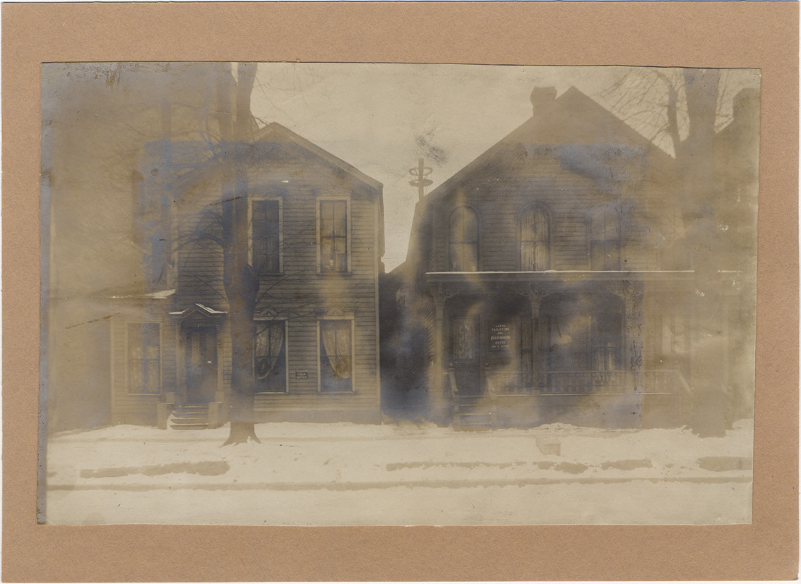 Favorite this☆ Unidentified houses on Miami Avenue Description: Two clapboard houses located on Miami Avenue, house on right advertises for tailoring and dressmaking. Handwritten on back: "___ side Miami Ave. south of Hartz Bldg. midway between Witherell & John R, Jan. 11, 1906." Details Resource ID: DPA4364 Subject: Wooden-frame houses--Michigan--Detroit Photographic prints Date Issued: 1906-01-11 Format: 1 photographic print mounted on stock ; image 4.5 x 6.75 in. Member of: Burton Historical Collection Filing Location: D/Streets-Miami Rights: Physical rights are retained by DPL. Copyright is retained in accordance with U.S. copyright laws.