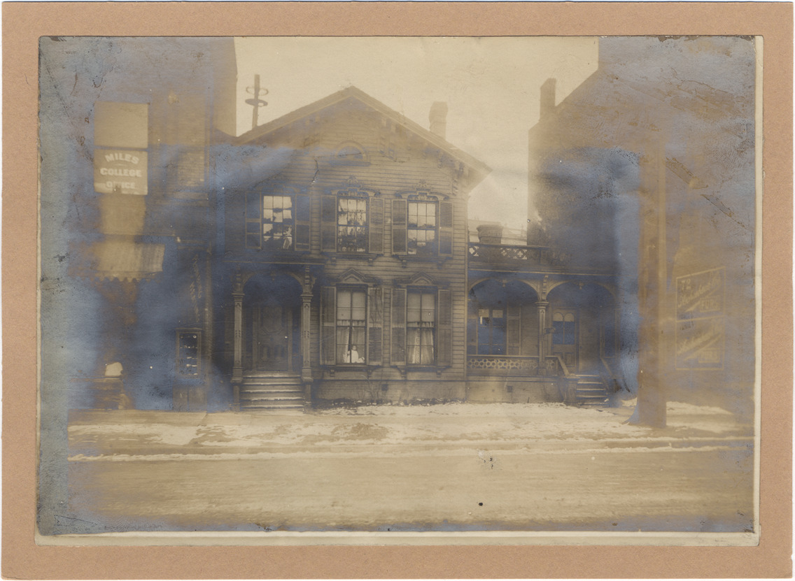 Two-story clapboard house located on Miami Avenue, north of Wilcox. Shuttered windows, and large side porch with another entranceway. Handwritten on back: "East Miami & north of Wilcox 2 or 3 doors, next south of Miles College, Jan. 12, 1906."