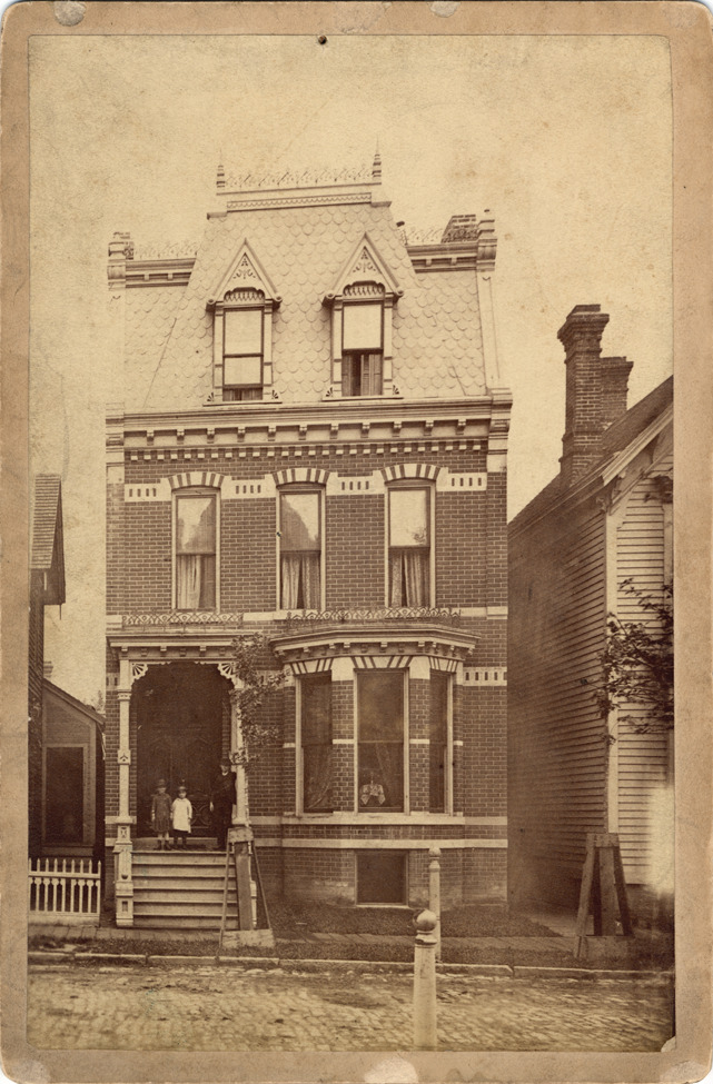 Narrow three-story brick house, with decorative shingles on Mansard roof and dormer windows. Two small children pose on front porch. Handwritten on back: "No. 60 Montcalm E. Erected by John Waterfall 1881, sold October, 1881 to M. Lally. Price $6,500.00, lot 25 x 90."