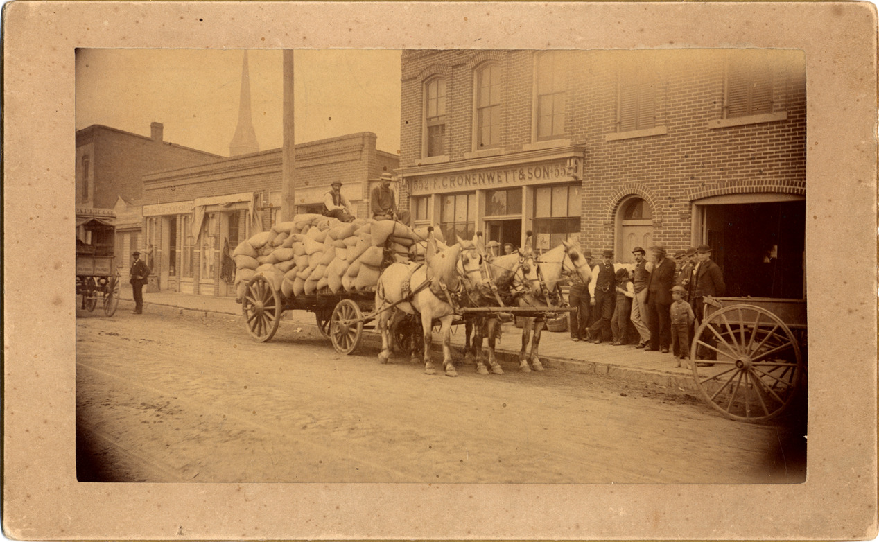 Favorite this☆ Horse-drawn wagon on Michigan Avenue Description: Three horses pulling large wagon loaded with high piles of sacks, two men sitting atop, in front of F. Cronenwett & Sons. Group of men and boys watch from sidewalk. Handwritten on back: "550-552 Michigan Ave. (city dir. 1886)." Details Resource ID: DPA4376 Subject: Horse-drawn vehicles--Michigan--Detroit Freight and freightage--Michigan--Detroit Commercial buildings--Michigan--Detroit Photographic prints Date Issued: 1886 (year approximate) Format: 1 photographic print mounted on mat board ; image 4.25 x 7 in. Member of: Burton Historical Collection Filing Location: D/Streets-Michigan Ave. Rights: Physical rights are retained by DPL. Copyright is retained in accordance with U.S. copyright laws.