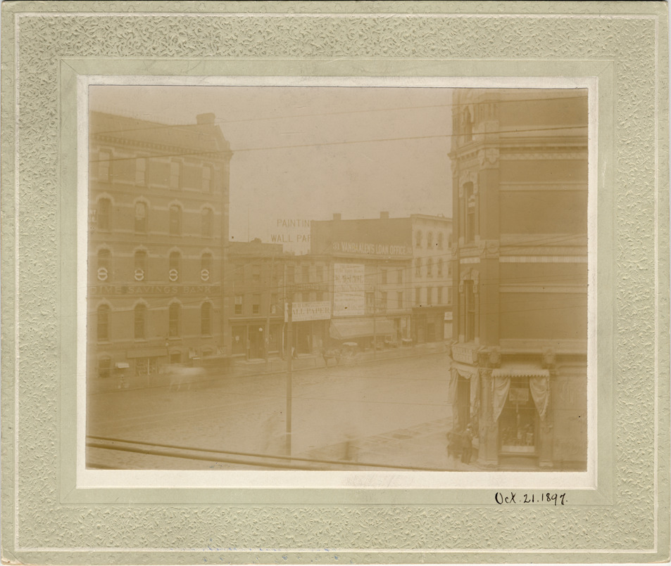 Businesses located on Michigan Ave., including Dime Savings Bank and Vanbaalen's loan office. Horse-drawn vehicles in front of stores. Handwritten on mat front: "Oct. 21, 1897." Handwritten on back: "Stores nos. 29 to 35 were formerly used as part of M.C.R.R. depot, freight."
