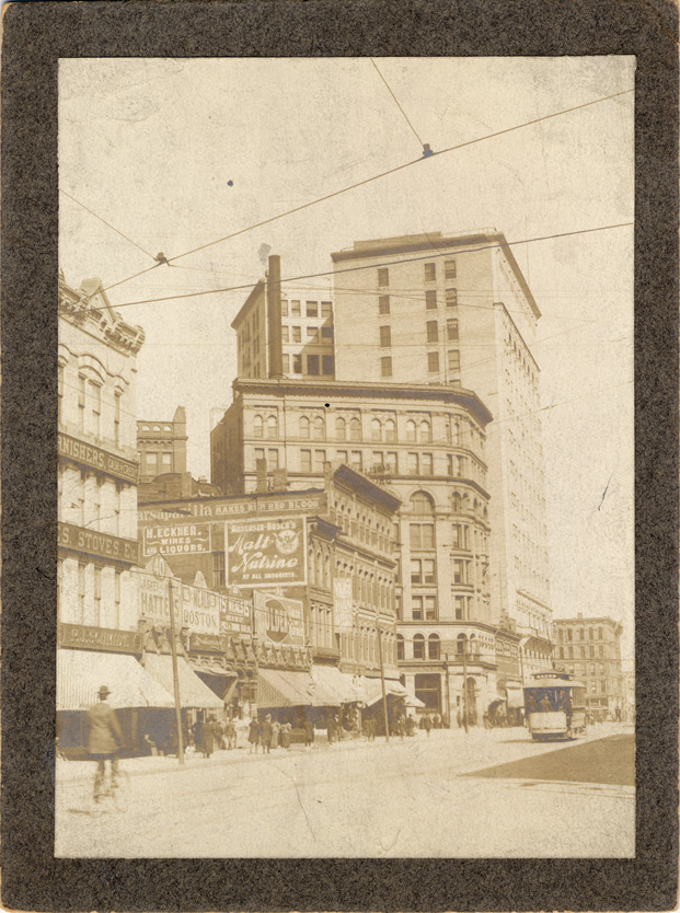 Businesses located on Michigan Ave. Pedestrians, trolley car, and man on bicycle in street. Handwritten on back: "North side Michigan Ave. between Shelby St. & Woodward Ave., March 19, 1900."