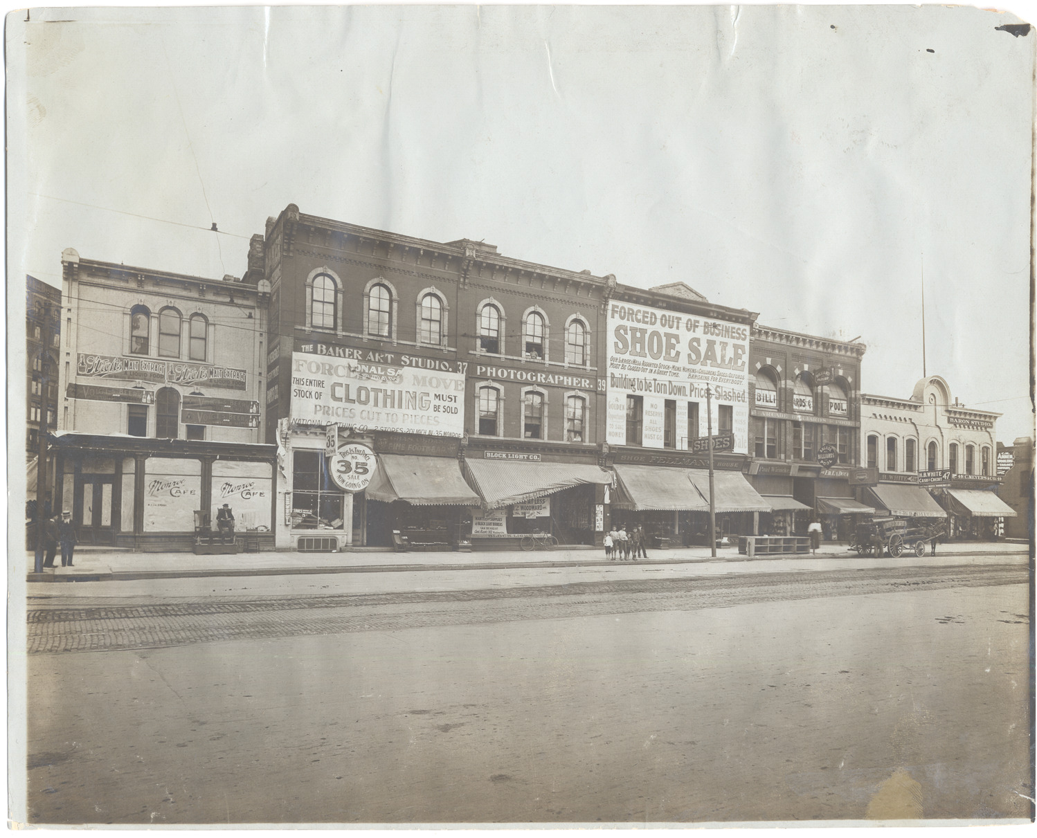 Brick commercial buildings along Monroe, viewed at an angle from street. Signs announce that buildings are being torn down and businesses are moving. Six boys stand in middle by curb; man on shoeshine stand; two men at edge. Signs read: Monroe Cafe; Baker Art Studio, photographers (C.R. Baker); National Clothing Co.; Chas. (Carlo) Oldani, fine footwear; Block Light Co.; Fellman's Shoe House; Paul Wieneke, men's furnishings; Ed. LaDouceur, clothing; H.B. White, clothing; C. Meyers & Co.; Baron Studio; C.M. Annen, woolens and tailor's supplies. Ads for: Stroh's Malt Extract; Voigt's Beer.