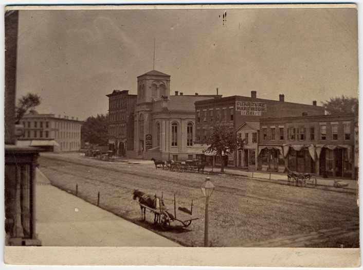 View from a height along unpaved street, with buildings on both sides. Horse-drawn vehicles parked on street. Signs include: Office of the Detroit Opera House; Fruits & oysters; Furniture warehouse. Handwritten on mat back: "Monroe Ave., 1872."
