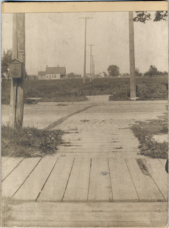 Looking across wooden sidewalks intersecting on residential street Houses and utility poles beyond. Fire alarm box on nearest pole. Handwritten on back: "May 26th, 1903. Dora Wiesenberg. Soutwest cor. of Palmer & Mt. Elliott. There had not been any change in the walk. F.S.Q."