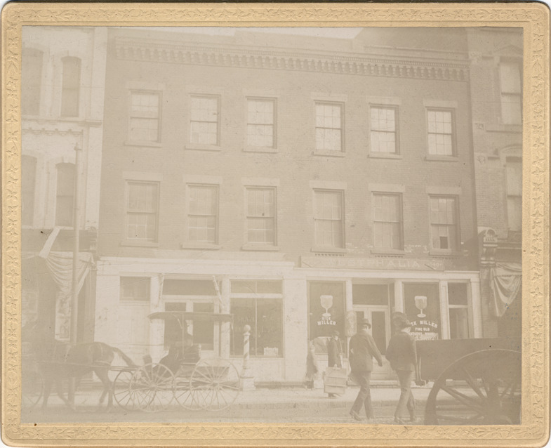 Brick building, with signs advertising barber shop. Horse-drawn carriages and pedestrians on street. Handwritten on back: "Three story brick building 140-142, Nicholas Miller saloon and barber, Randolph St., site County Bldg."