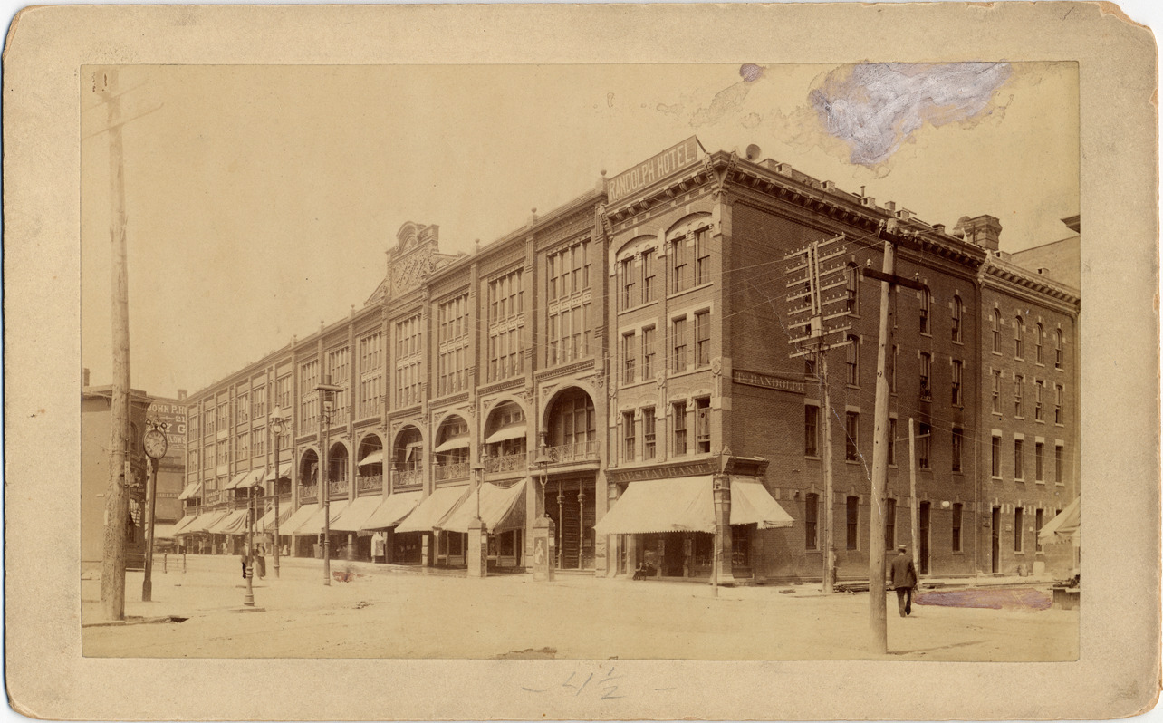 Randolph Hotel, on corner of long four-story building, with awnings over lower floor. Restaurant at corner of building. Handwritten on back: Lyceum Theater, (1008) Randolph, e. side between Lafayette and Monroe, n.e. corn. Lafayette, about 1883." Stamped on back: "From Alvord & Co., exclusively commercial photographers, 55 Rowland St., Detroit, Mich., ground floor."
