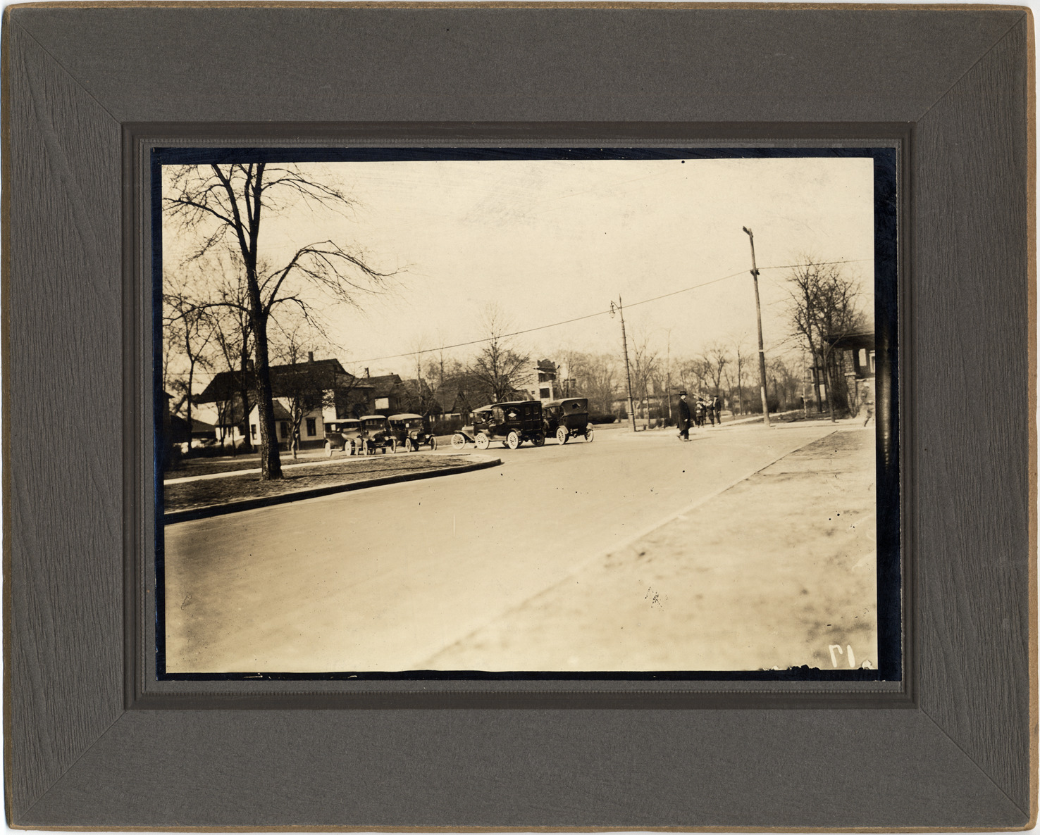 Residential and commercial buildings in background, at Lafayette & Scotten. Several cars parked in street in foreground.