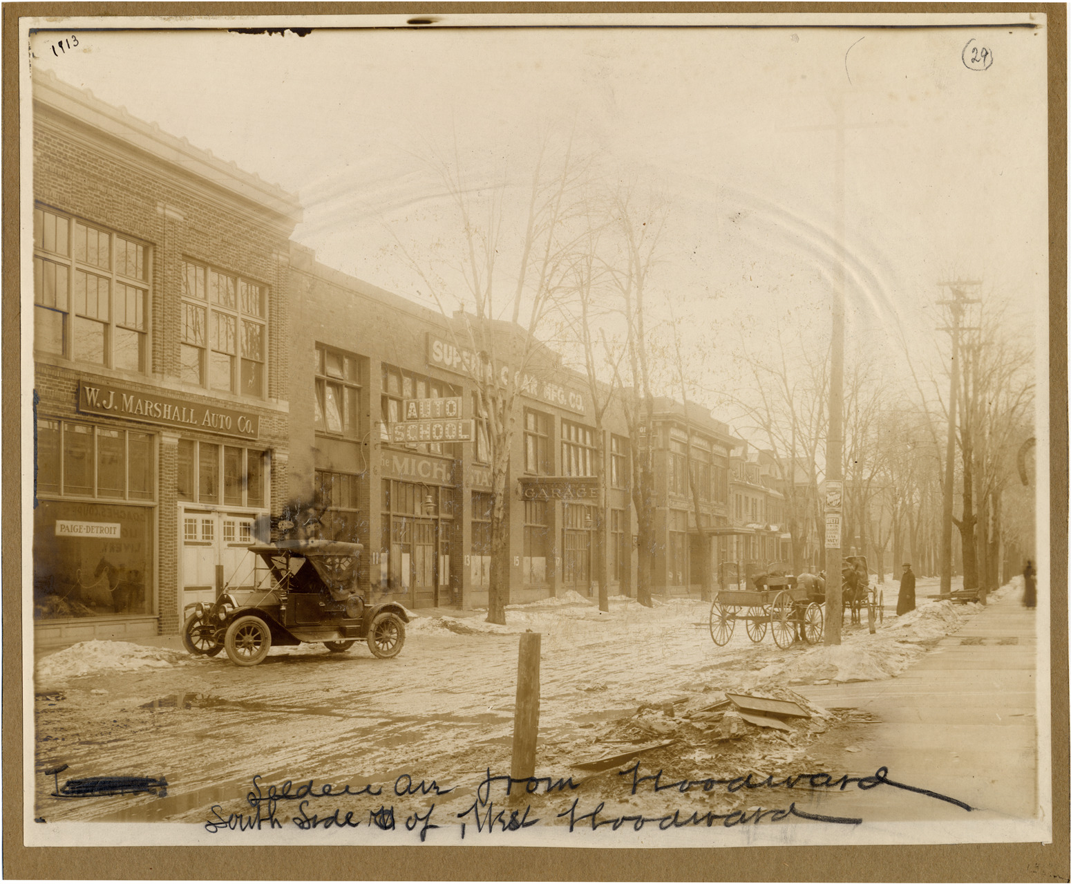 Commercial buildings along Selden Avenue. Businesses include W.J. Marshall Auto Co. and Superior Car Manufacturing Co. with sign for auto school. Car on left side of street; horse-drawn wagon on right side of street. Handwritten on front: "Selden Ave. from Woodward, south side of West Woodward."Handwritten on back: "Selden Ave. near Woodward, 1913, south side."