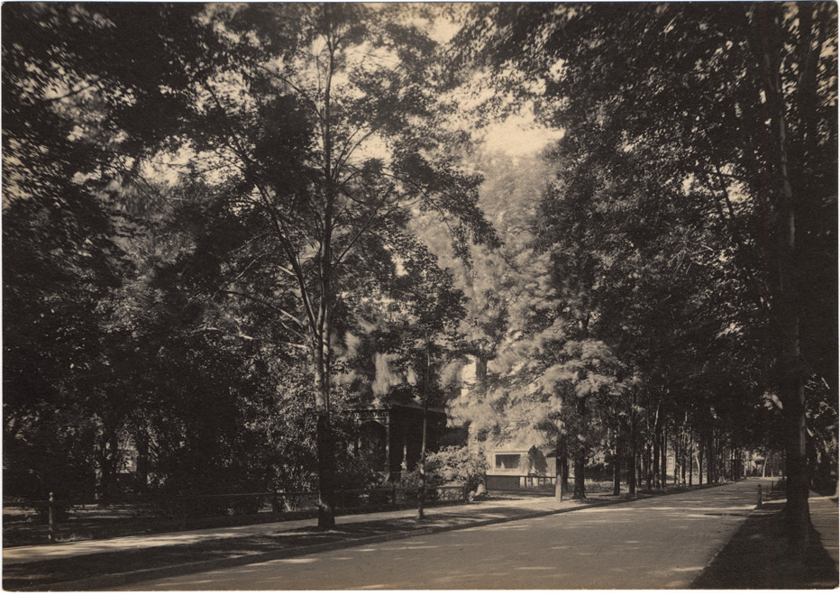View of tree-lined street with sidewalk. Handwritten on back: "Stimson & Woodward, 1906?"