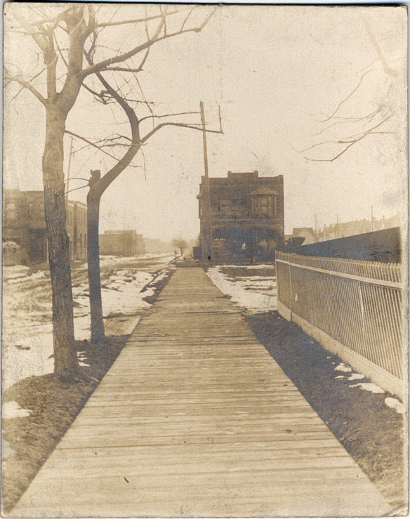 View of wooden sidewalk and fence on street during winter; building at intersection; sign on building: "Bargain grocery." Handwritten on back: "Feb 13th 1903, Ella Amsden, Theodore St. just east of Russell St., looking west, there had not been any change in the walk, F.S.Q."