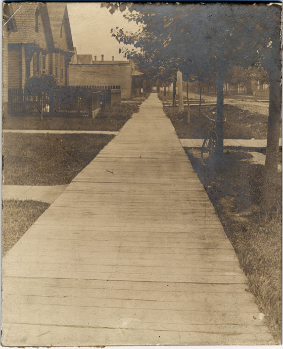 Favorite this☆ Wooden sidewalk on Thirty-first Street Description: View of wooden sidewalk on tree-lined street with houses; bicycle leans against tree. Handwritten on back: "June 12th 1902, Viola Wilson in front 289 31st St. looking north, F.S.Q." Details Resource ID: DPA4476 Subject: Sidewalks--Michigan--Detroit Photographic prints Date Issued: 1902-06-12 Format: 1 photographic print mounted on mat board ; 4.5 x 3.75 in. Member of: Burton Historical Collection Filing Location: D/Streets-Thirty-first Rights: Physical rights are retained by DPL. Copyright is retained in accordance with U.S. copyright laws.