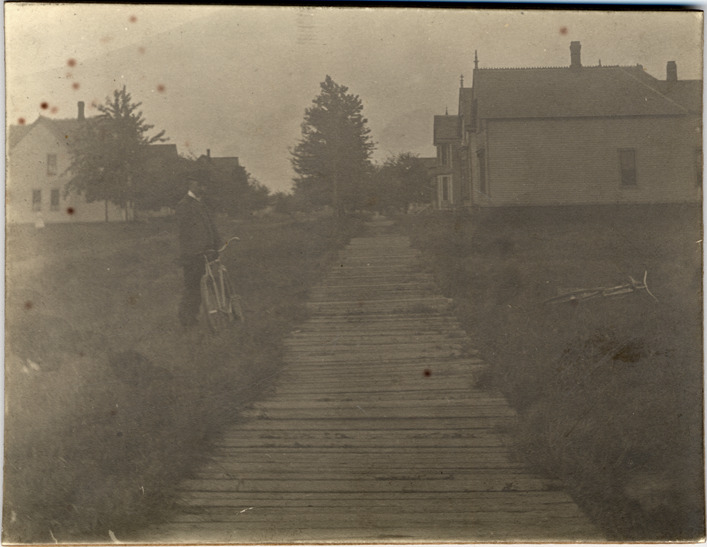 View of wooden sidewalk; man stands next to sidewalk with bicycle; another bicycle lays in the grass on the other side of sidewalk; houses in distance. Handwritten on back: "Aug. 31st 1901, Rosa Schmidt looking south on the west side Townsend from Ferry Ave., F.S.Q."