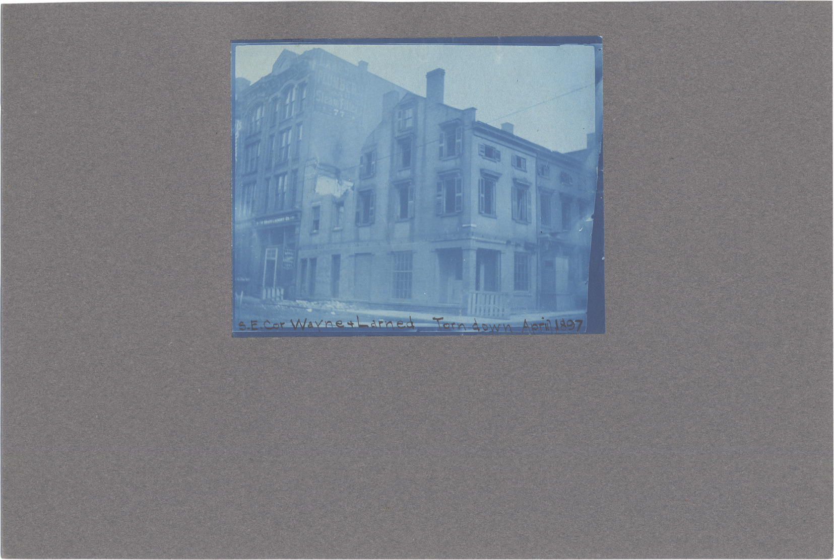 Favorite this☆ Buildings at Wayne and Larned Description: Brick buildings, viewed diagonally from intersection. Corner building has no glass in windows. Handwritten on photograph front: "S.E. cor. Wayne & Larned. Town down April 1897." Details Resource ID: DPA4502 Subject: Commercial buildings--Michigan--Detroit Streets--Michigan--Detroit Cyanotypes Photographic prints Date Issued: Unknown year Format: 1 photographic print mounted on stock ; image 4 x 5 in. Member of: Burton Historical Collection Filing Location: D/Streets-Wayne & Larned Rights: Physical rights are retained by DPL. Copyright is retained in accordance with U.S. copyright laws.