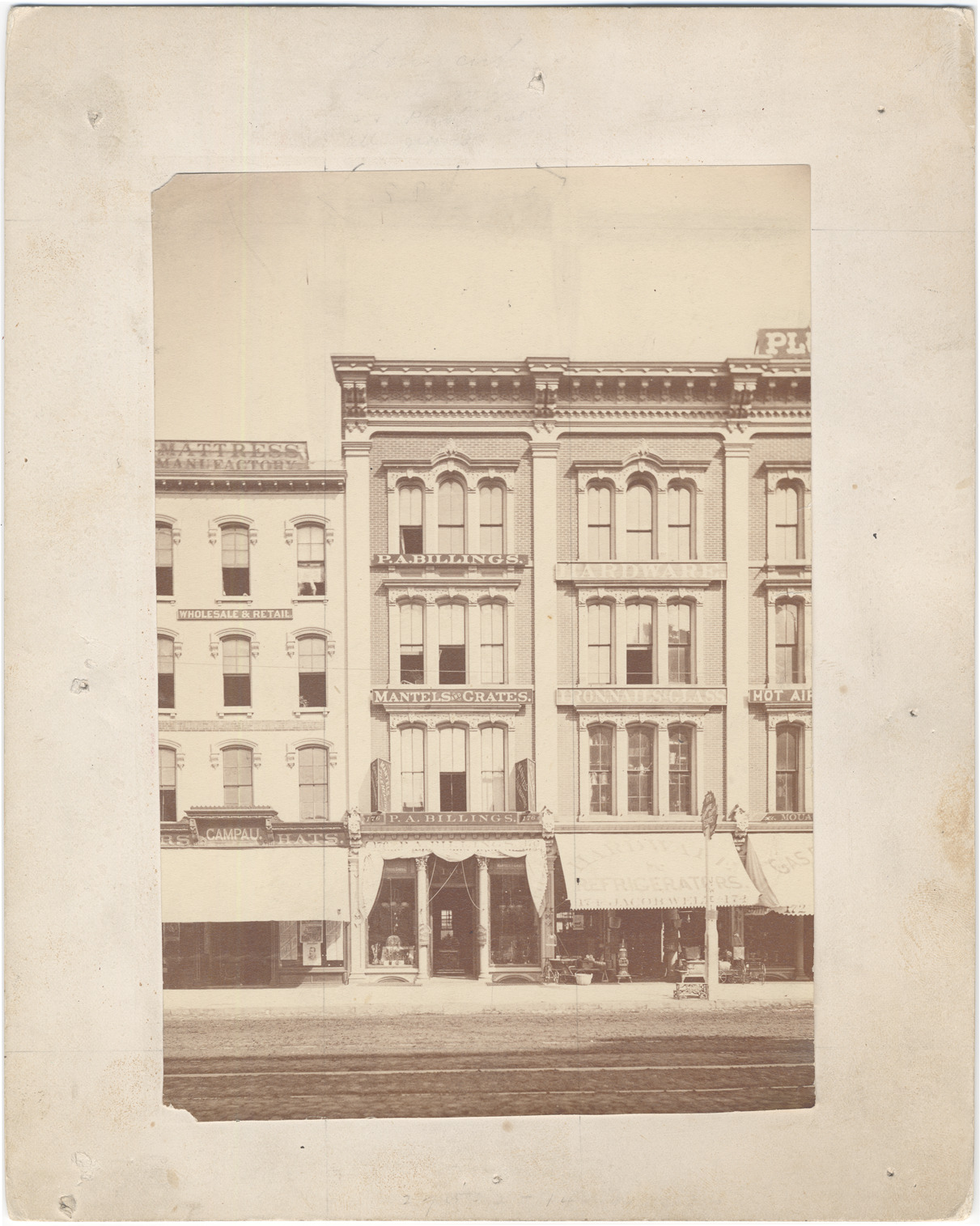 Brick commercial buildings, viewed across street. Street numbers 172-178. Signs include: Matress manufactory, wholesale & retail; Campau; P.A. (Pulaski A.) Billings, mantels & grates; Jacob Welz,hardware, iron, nails, glass, refrigerators. Handwritten on mat back: "East side Woodward above Gratiot, 1881. P. A. Billings & Co., 176 Woodward Ave. Pulaski A. Billings. Folder II. 91." Photograph flaking at corners; mat marked.