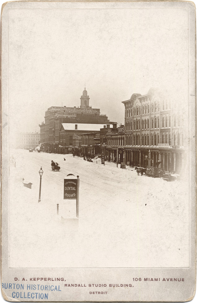 View along snow-covered street, with horse-drawn sleds. Buildings along opposite side of street and on cross street. Signs include: J. Younghusband, dental, rooms; Weber Furniture Co. warehouse; Freedman & Bro's., dry goods, millinery; Michigan Dental Depot; Gilmore; Gibbs, book bindery & stationery; Butterick Patterns; Arnold & Willyoung, books & stationery; Singer; Cothard & [Colvin?]; Wheeler & Wilson, manufacturing; C. Adringer. Printed on card front: "D.A. Kepperling, 106 Miami Avenue, Randall Studio Building, Detroit." Handwritten on card back: "Woodward, ca. 1880. West side north from Grand River [corrected from Fort]. II. 109."