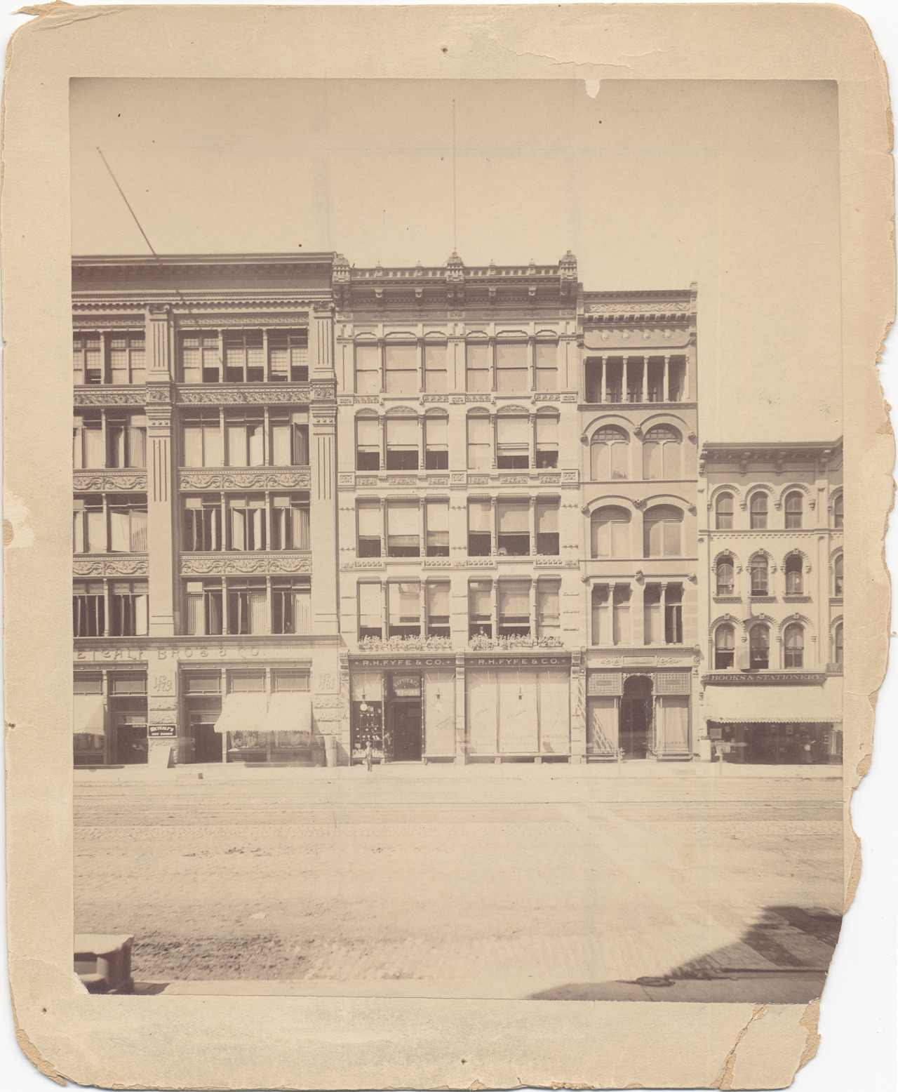 Favorite this☆ Buildings on Woodward, 1887 Description: Stone and brick commercial buildings, viewed across street. Street numbers 179-189. Signs include: Metcalf Bros. & Co., dry goods; R.H. Fyfe & Co.; books & stationery. Handwritten on mat back: "West side, 1887. 179-185 Woodward Ave. 179-181, Metcolf Bros.; 183-185 R.H. Fyfe & Co.; 187, Hugo Hill [millinery]; 189, Hunt & Eaton, book store." Photograph flaking; mat damaged at corners and side. Details Resource ID: DPA4516 Subject: Commercial buildings--Michigan--Detroit Woodward Avenue (Mich.) Streets--Michigan--Detroit Albumen prints Photographic prints Date Issued: 1887 Format: 1 photographic print mounted on mat board ; image 8.75 x 7.5 in. Member of: Burton Historical Collection Filing Location: D/Streets-Woodward Rights: Physical rights are retained by DPL. Copyright is retained in accordance with U.S. copyright laws.