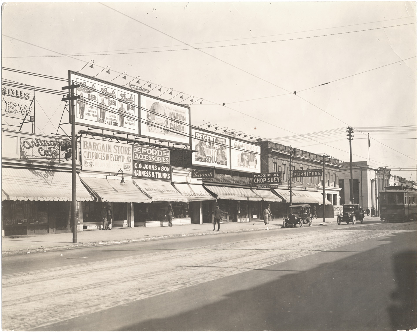 Buildings along Woodward, viewed diagonally from street toward Milwaukee. Signs include: Arlington Cafe; Bargain Store; C.G. (Chas.) Johns & Son, harness & trunks; Ford Accessories; Splendid Lunch; Peacock Inn Cafe, chop suey; Blakeslee-Hoffman Co., furniture; the Detroit News. Walker & Co. billboards: Stroh's beer; Ward's fine cakes; Regent; Package twin six. Stamped on photograph back: H.W. Brooks, commercial photographer, Arcadia Bldg., Detroit, Mich." Handwritten on photograph back: "Woodward, between Milwaukee & E. Grand Blvd., ca.1915. #862."