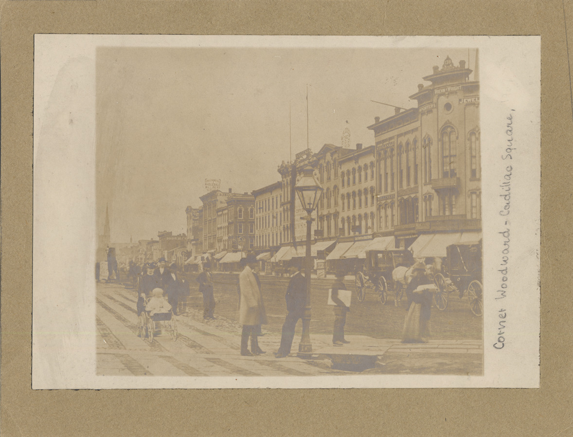 View of commercial buildings with awnings; horses and carriages in street; in foreground, pedestrians stand on sidewalk, a woman pushes a baby carriage, a man leans against a lamppost. Building on corner is Roehm & Wright. Handwritten on front: "Corner Woodward - Cadillac Square."