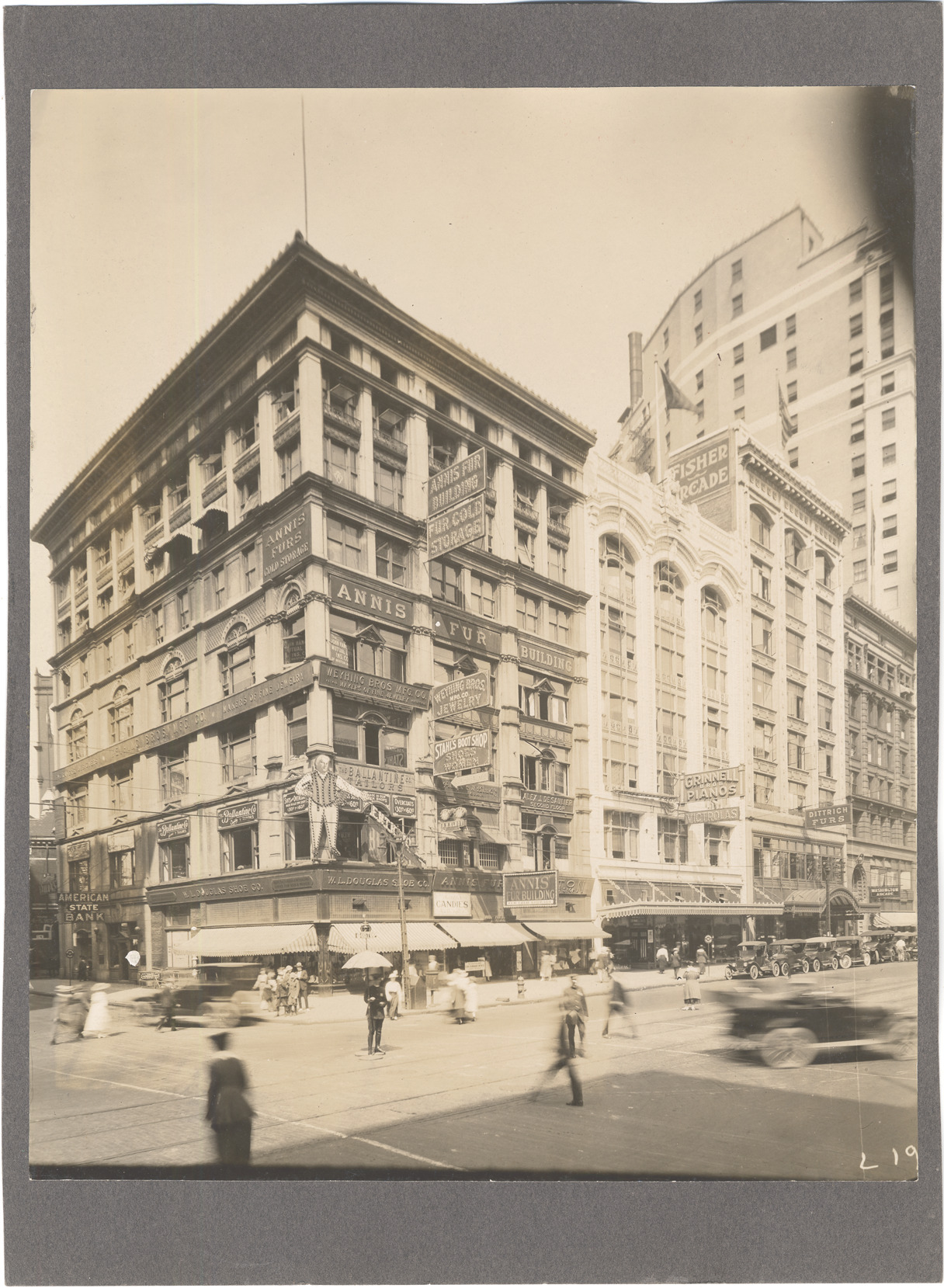 View of buildings on corner of Woodward and Clifford; policeman stands in intersection under umbrella and traffic signal; building on corner is Annis Fur building; Grinnell Brothers pianos and Dittrich furs are next door; pedestrians on sidewalk; automobiles parked in street. Handwritten on back: "N.W. corner Woodward and Clifford, 1917."