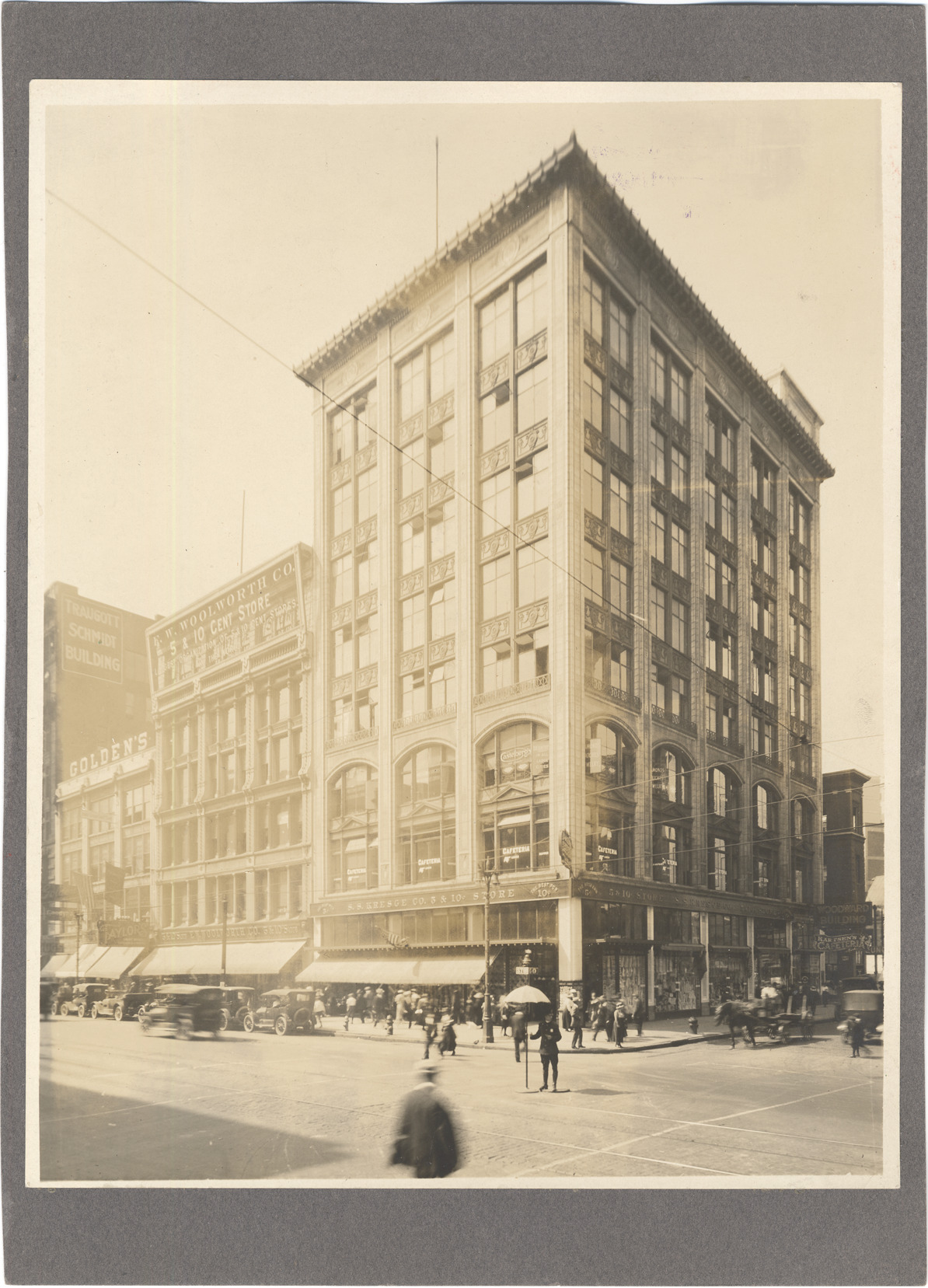 View of buildings on the corner of Woodward and Clifford; policeman stands in intersection under umbrella and traffic signal; multistory building on corner is S.S. Kresge Co. store. Handwritten on back: "S.W. corner Woodward and Clifford St. 1917."