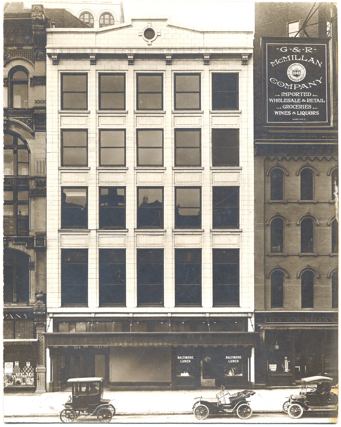 View of multistory building; "Baltimore Lunch" in windows of storefront; automobiles parked in street. Sign on building next door: "G & R McMillan Company, imported wholesale & retail groceries, wines & liquors." Handwritten on back: "West side near Fort, c.1914."
