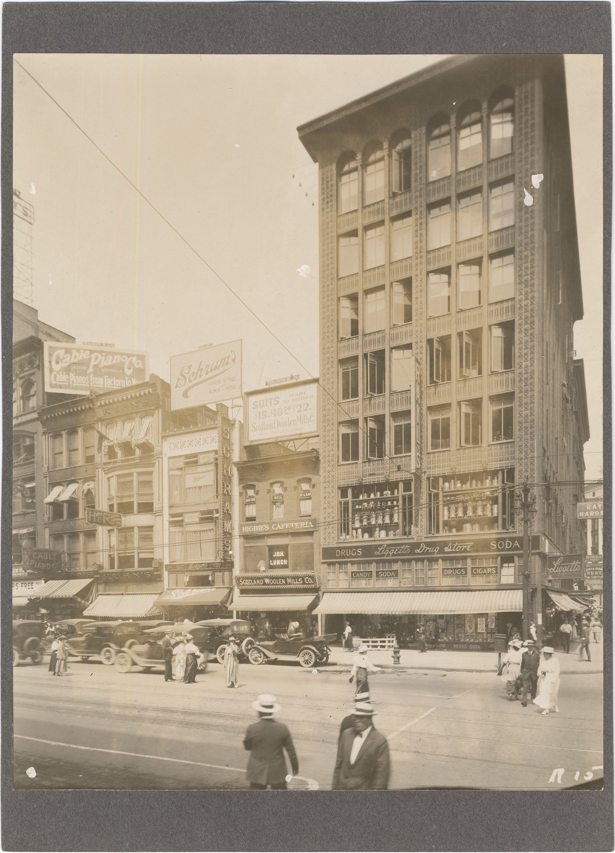 Favorite this☆ Woodward Avenue and Grand River Description: View of Liggett's Drug Store and other commercial buildings on Woodward Ave. near corner of Grand River. Businesses include the Cable Piano Co., Kuhn's, Schram's, Higbie's cafeteria and Scotland Woolen Mills Co. Details Resource ID: DPA4569 Subject: Commercial buildings--Michigan--Detroit Drugstores--Michigan--Detroit Woodward Avenue (Mich.) Streets--Michigan--Detroit Photographic prints Date Issued: Unknown year Format: 1 photographic print mounted on stock ; image 9.5 x 7.75 in. Member of: Burton Historical Collection Filing Location: D/Streets-Woodward & Grand River Rights: Physical rights are retained by DPL. Copyright is retained in accordance with U.S. copyright laws.