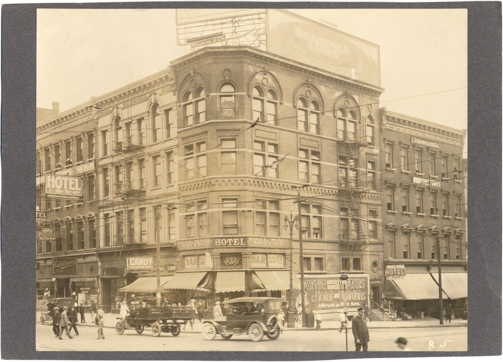 View of commercial buildings at the corner of Woodward and Jefferson; automobiles in street; policeman in foreground. Signs on building: "Edelweiss buffet; Detroit candy kitchen; Pall Mall Hotel; L. Schiappacasse & Co. wholesale fruits." Handwritten on back: "Pall Mall Hotel, 62 Woodward; Edelweiss buffet, 180 Jefferson; Schiappacasse, Louis T., 56-58 Woodward." Label on back: "Woodward Ave. & Jefferson S.E. corner, 1917."