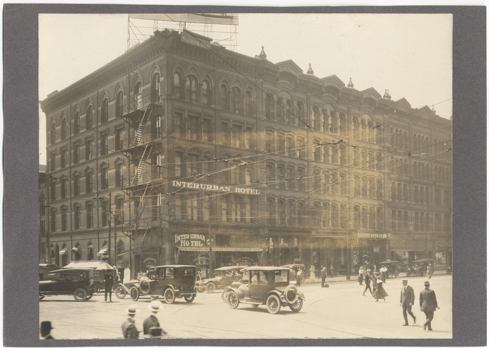 View of commercial buildings at corner of Woodward and Jefferson; multistory brick building with window enframements and fire escape; automobiles in intersection; policeman standing with traffic signal; pedestrians cross streets; signs on buildings: "Interurban hotel; United News Co." Handwritten on back: "Woodward Ave. and Jefferson, southwest corner, 1917."