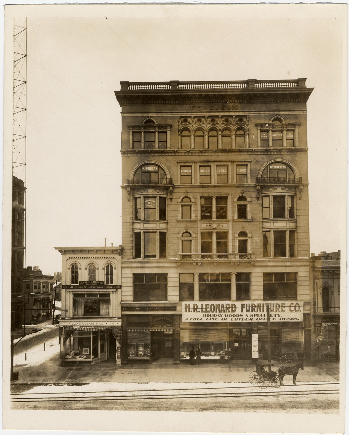 View of buildings on Woodward near John R; multistory building with balustrade on roof; sign on building: "H. R. Leonard Furniture Co., holiday goods a specialty, a full line of Cutler office desks." Signs on adjacent storefronts: "E. A. Kepler & Co., successors to E. H. Husher & Co., photographers; William O'Leary & Co.; Arthur & Philbric." Horse and carriage in front of building. Handwritten on back: "Ferguson building; Woodward and John R, S.E. corner."