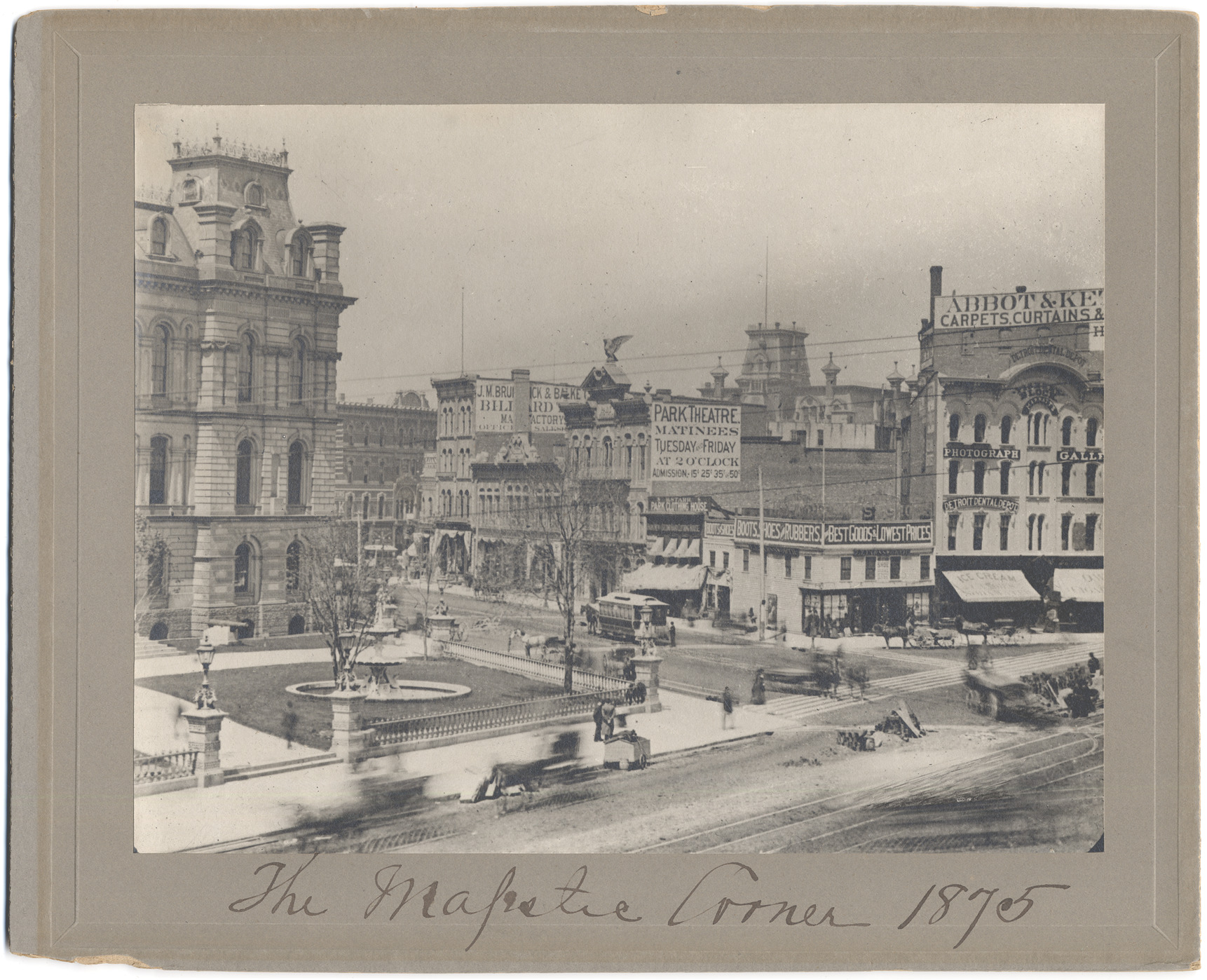 View of intersection at Woodward and Michigan; Second Empire style house on corner with cupola; front yard has fountain and is surrounded by low fence. Horse-drawn streetcars and wagons in street; signs on buildings: "Park Theatre matinees, Tuesday and Friday at 2 o'clock; H. Starr Park clothing house; Detroit Dental Depot." Handwritten on front: "The Majestic corner, 1875."