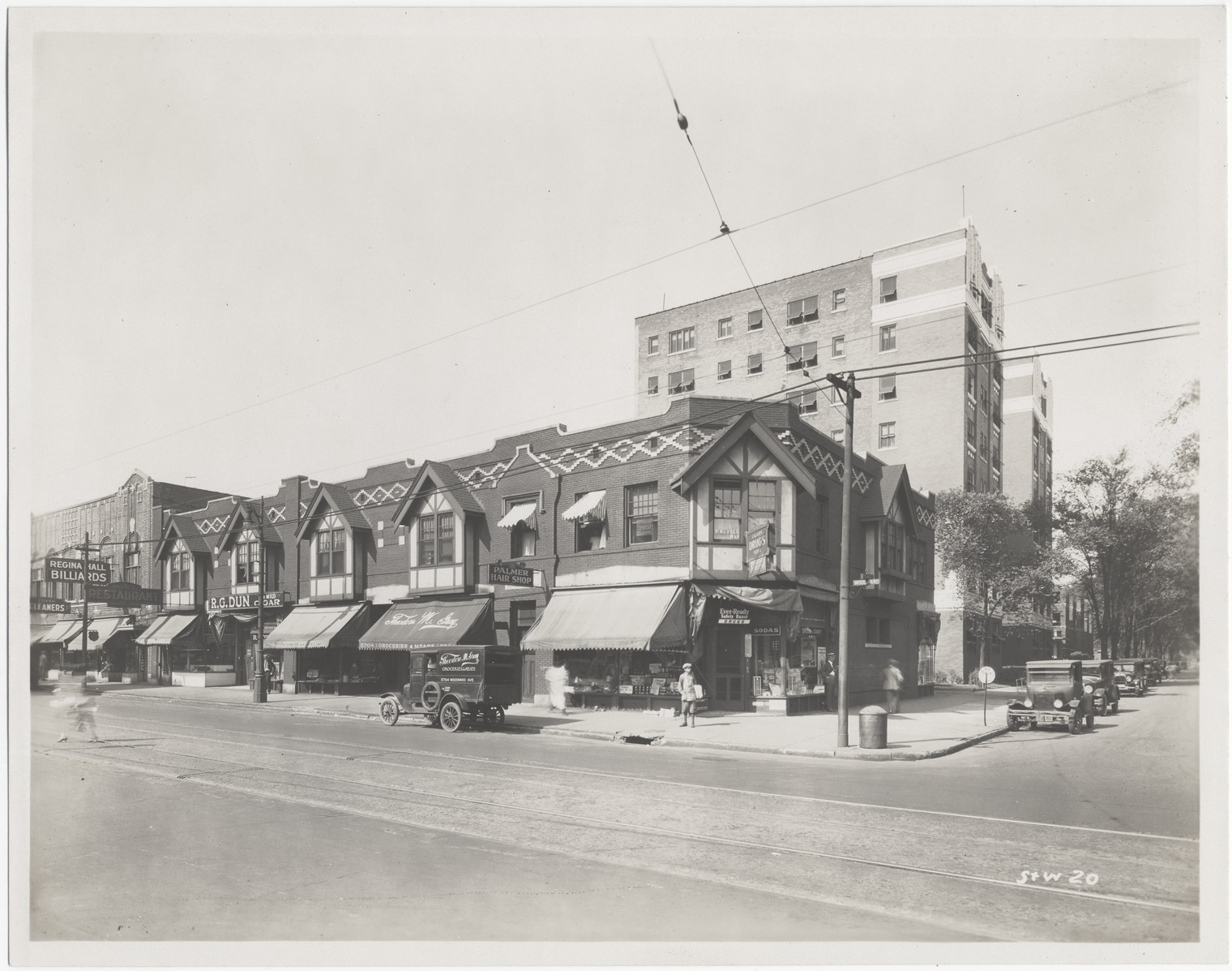 View of two-story brick commercial building at corner of Woodward and Palmer; building has half-timbered gables. Signs on buildings: "R.G. Dun; Theodore M. Gray, groceries and meats; Palmer Hair Shop." Drugstore on corner; grocery truck parked in front of stores; boy carrying bag stands on corner.