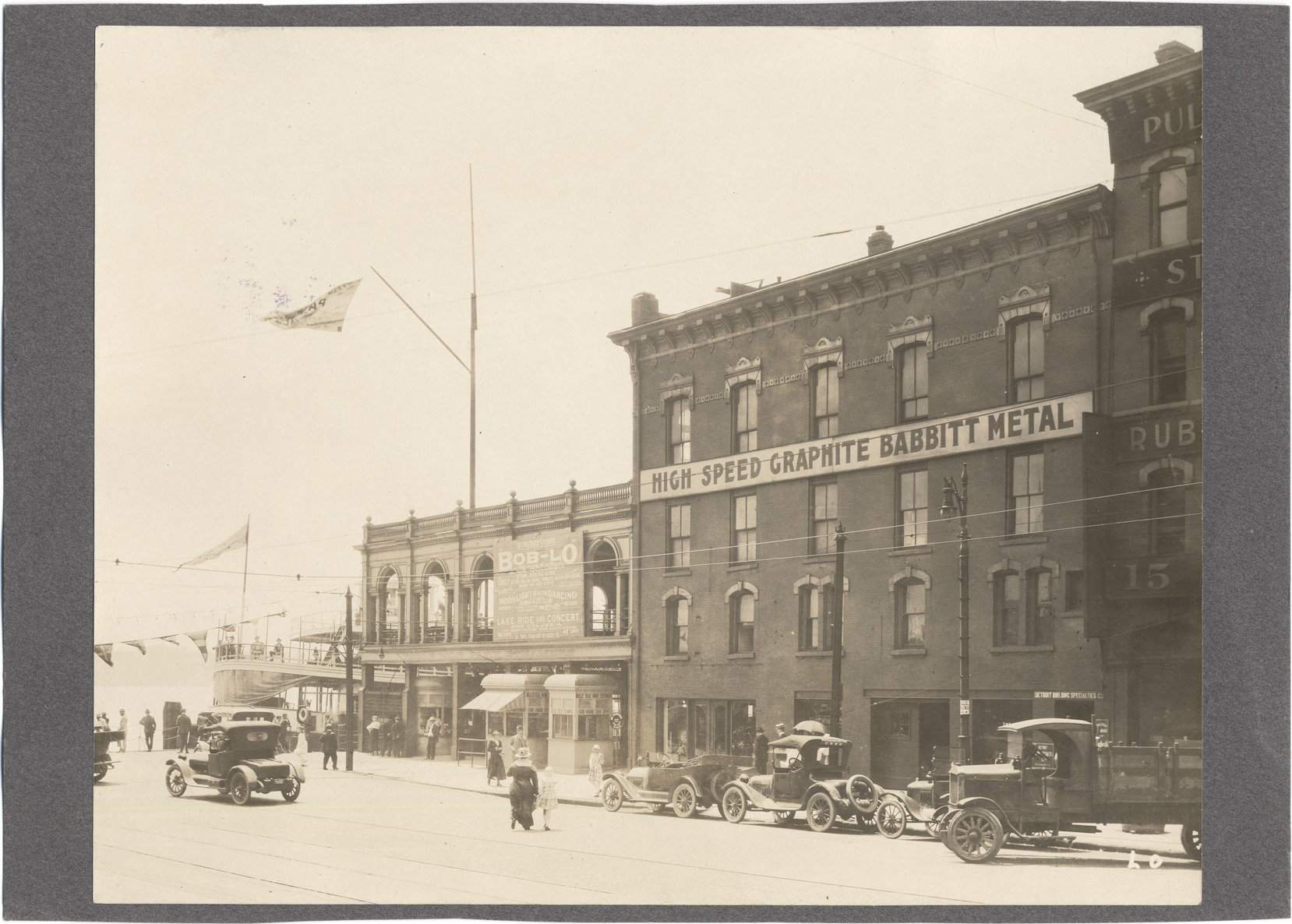 View of foot of Woodward Avenue at Detroit River; Bob-Lo ticket office; ferry with passengers at dock; brick building with sign: "High speed graphite Babbitt Metal." Automobiles and truck in street; pedestrians on sidewalk and dock. Label on back: "Woodward Ave. & River."