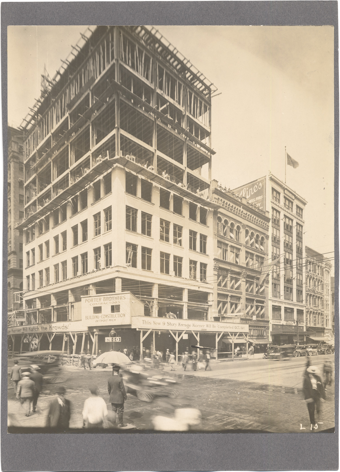 View of building under construction at Woodward and State; men working on upper levels; pedestrians and policeman in intersection; signs on building: "Porter Brothers, contractors, building construction, Detroit, Mich.; Kresge Korner will katch the krowds!; This new 9 story Kresge Korner will be completed Oct. 1st." Label on back: "Woodward Ave. & State St., N.W. cor., 1917, Kresge, Bird, Kline's, Fyfe."