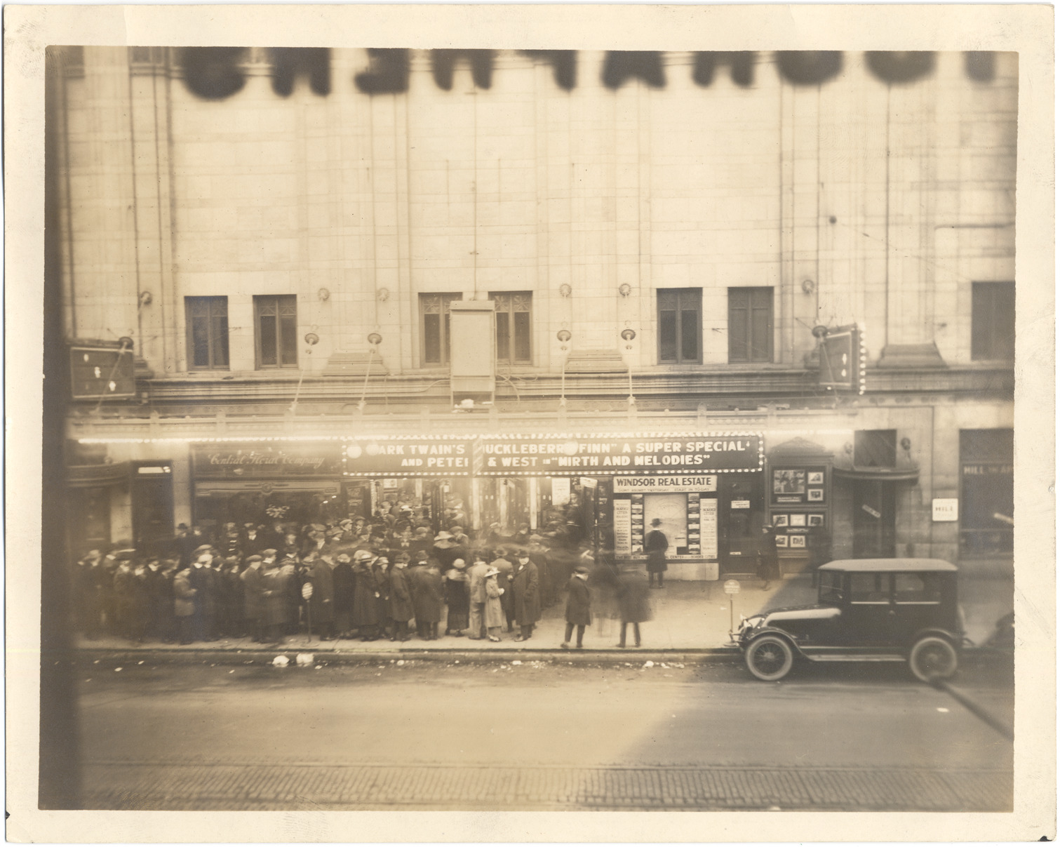 Night scene of crowd at box office of the Broadway Strand Theatre, on Broadway near Gratiot. Marquee advertises "Mark Twain's 'Huckleberry Finn' a super special, and Peters & West in 'Mirth and Melodies.'" Signs include: Central Floral Company; Windsor Real Estate. Handwritten on photograph back: "Broadway Strand." Glue and paper on photograph back; removed from album.