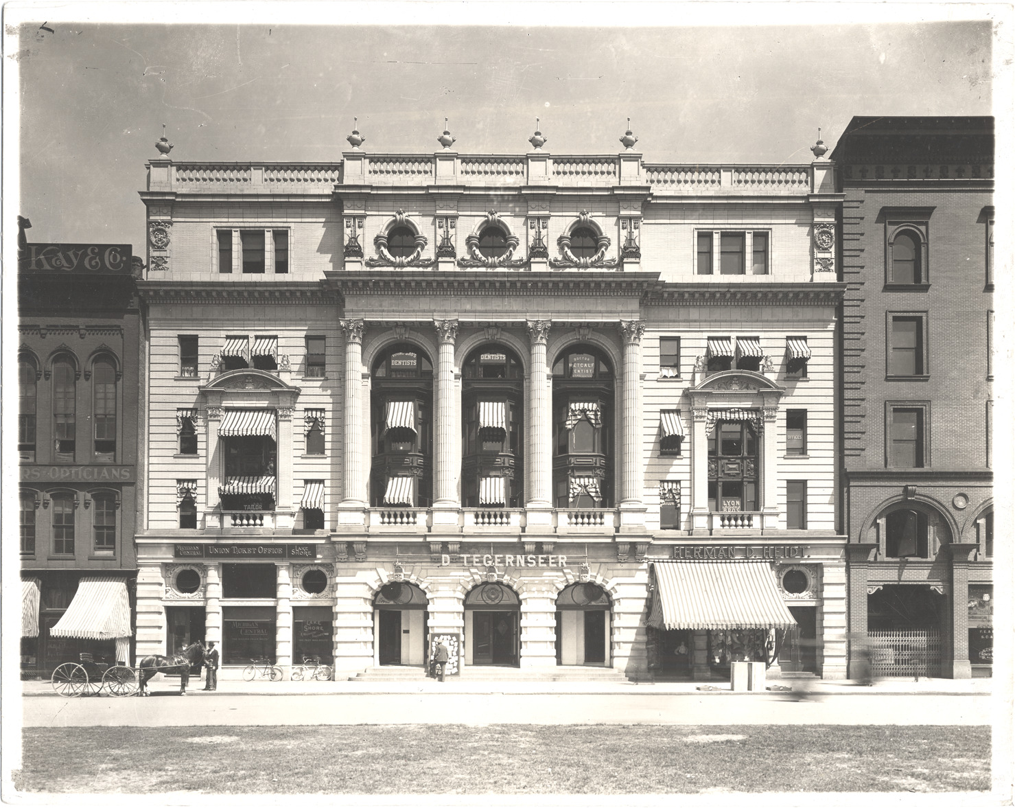 Viewed directly across street from lawn. Man on steps and another man by horse-drawn carriage; bicycles against wall. Signs include: [Wright] Kay & Co.; Union Ticket Office; Michigan Central, the Niagara Falls route; Lake Shore & Michigan Souther, the fast mail route; D. Tegernseer; Herman D. Heidt; Young Bro's., dentists; Doctor Metcalf, dentist. Handwritten on photograph back: "Det. Opera House."