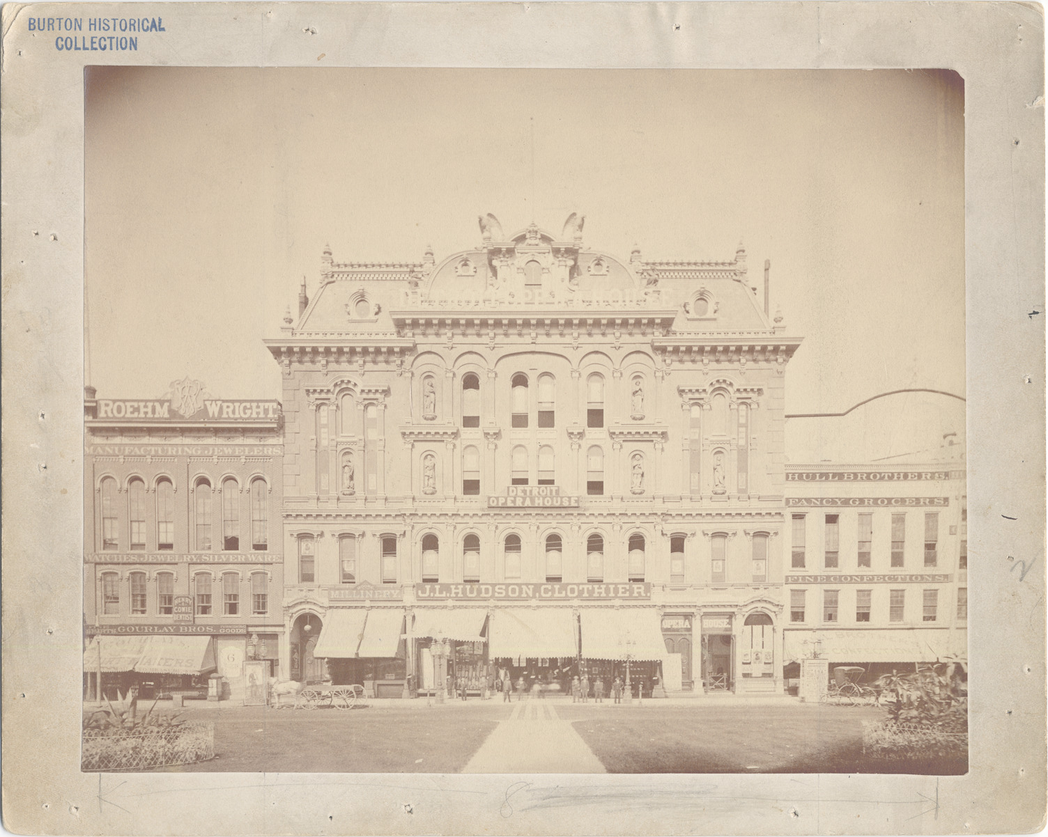 Viewed directly across street from park. Scattered people by entrance; horse-drawn vehicles. Signs include: Roehm Wright, manufacturing jewelers; Gourlay Bros., furnishing goods; Henry Cowie, dentist; Moore, millinery; J.L. Hudson, clothier; Hull Brothers, fancy grocers, fine confections. Handwritten on mat back: "Detroit Opera House, 1883. Campus Martius. 23 (in circle).."