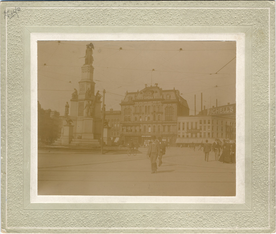 View across Campus Martius, showing pedestrians in front of Opera House and Soldiers' and Sailors' Monument. Signs for Michell's. Handwritten on mat back: "Detroit Opera House before the fire. Photo taken by Victor C. Gnau, Oct. 6, 1897, before the fire." Handwritten on duplicate mat back: "The day before the fire. Taken Wednesday Oct. 6, 1897 at 12.30 noon."