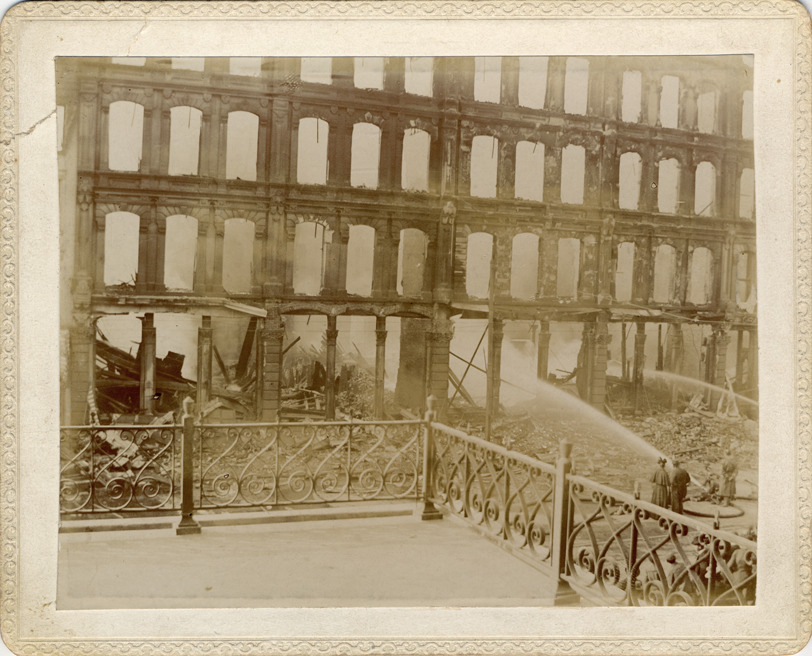 View from balustraded porch of firefighters spraying water on building. Handwritten on card back: "Other bldgs. burned with Detroit Opera House - it took place in 1890's."