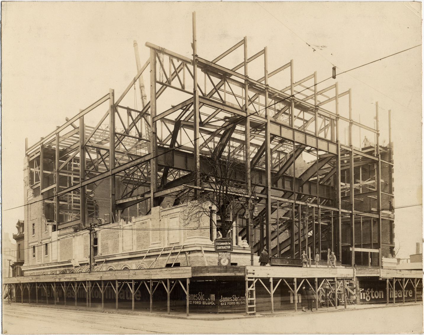 Brick building being constructed on metal girders. Workers on walls and scaffolding. Signs include: Washington Theatre; F.H. Goddard, Inc., contractor; Wabash Portland Cement Company; James Slocum. Handwritten on photograph back: "Washington Theater."