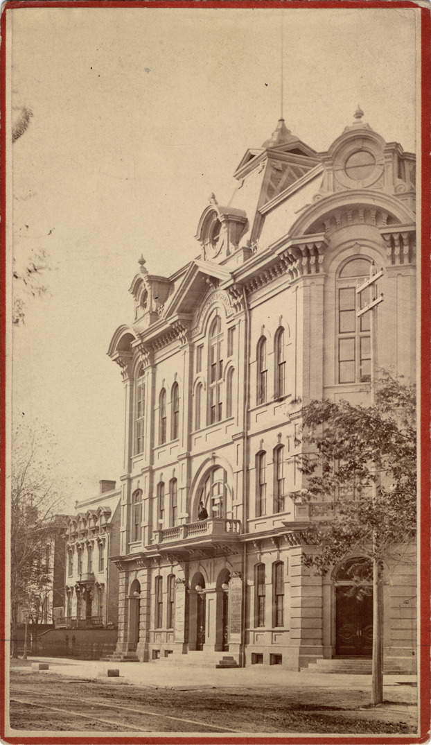 Stone theatre building viewed at an angle from street. Printed on label on card back: "New series. Panoramic and cabinet sketches, in and about the city of Detroit. Photographed and published by Jex Bardwell, 31 Monroe Avenue." Handwritten on card back: "Whitney's Opera House, Fort St. & Shelby. 1880."