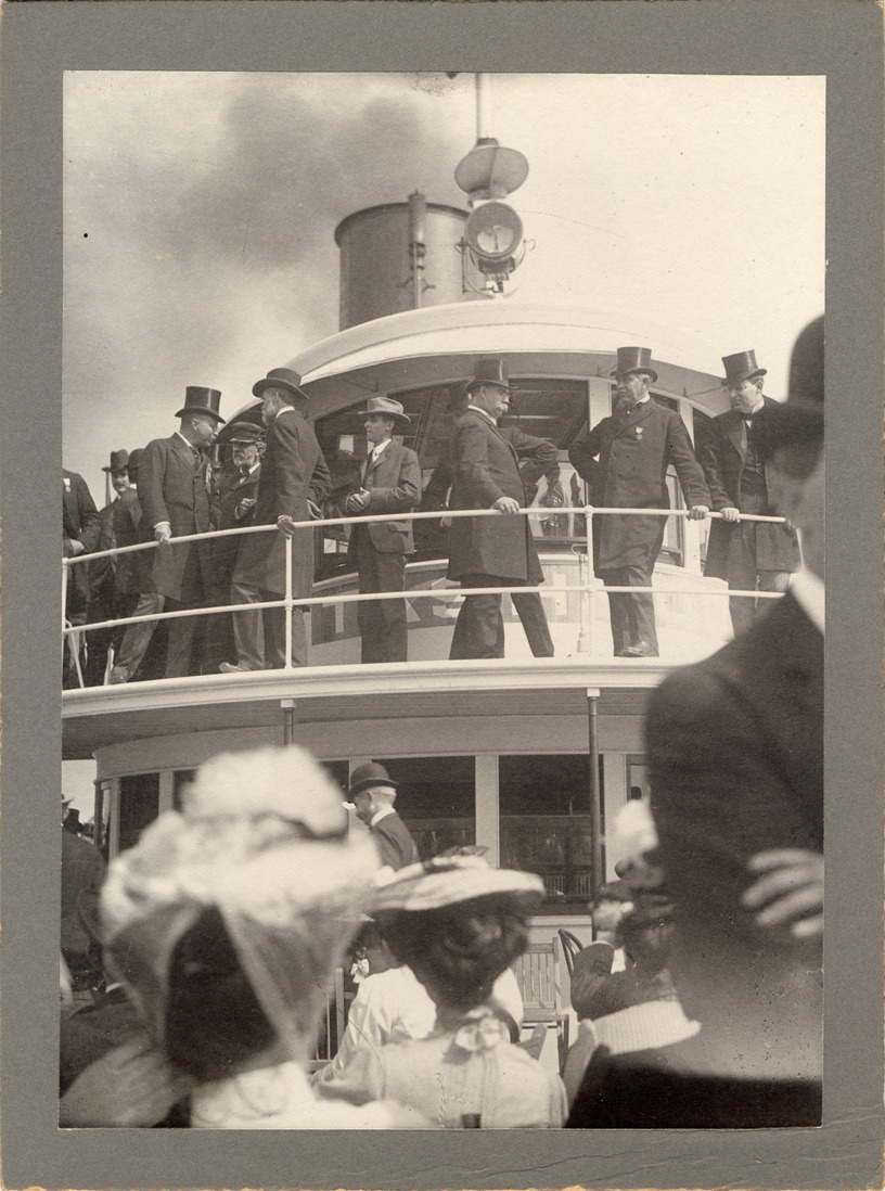 Favorite this☆ Theodore Roosevelt on the deck of the "Tashmoo" Description: View of Theodore Roosevelt, wearing top hat, talking to men on the upper deck of the excursion steamer "Tashmoo." Crowd on lower deck. Details Resource ID: DPA4650 Subject: Roosevelt, Theodore, 1858-1919 Excursion boats--Michigan--Detroit Photographic prints Date Issued: Unknown year Format: 1 photographic print mounted on mat board ; image 6.5 x 4.75 in. Member of: Burton Historical Collection Filing Location: D/Visitors Rights: Physical rights are retained by DPL. Copyright is retained in accordance with U.S. copyright laws.