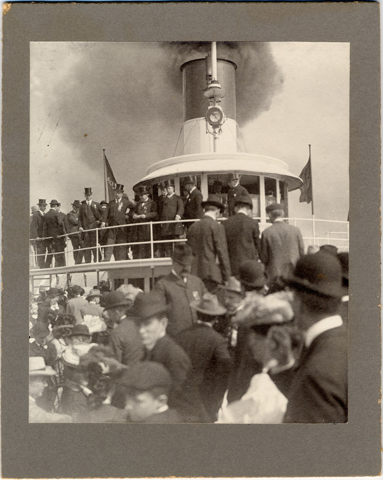 Theodore Roosevelt, and other men wearing top hats, gather on the upper deck of the excursion steamer "Tashmoo." Crowd on lower deck.