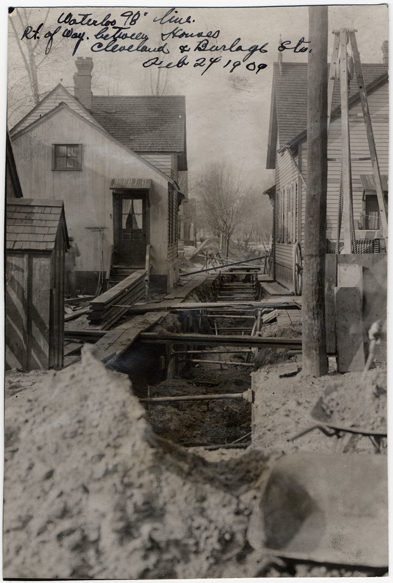 View of ditch between two houses; ditch supported by pipes; planks alongside ditch; wheelbarrows and pile of dirt in foreground. Handwritten on photograph: "Waterloo 98' line. Rt. of way between houses, Cleveland and Burlage Sts., Feb 24, 1909." Handwritten on back: "Breaks."