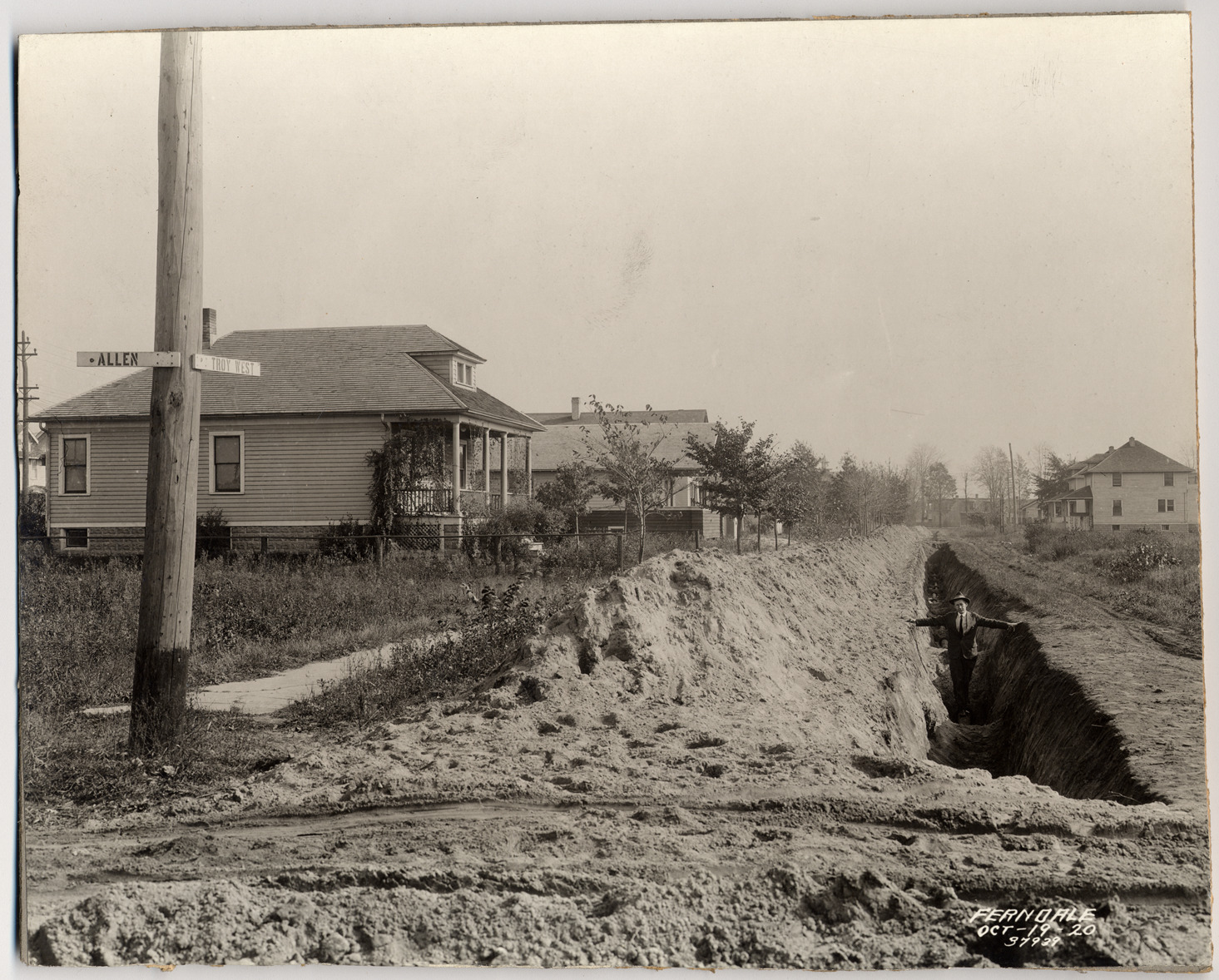 Favorite this☆ Man standing in ditch Description: Man wearing hat stands in a ditch in the middle of a dirt road; houses on street; street signs on corner: "Allen; Troy west." Printed on photograph: "Ferndale, Oct-19-20, 37939." Details Resource ID: DPA4696 Subject: Streets--Michigan--Ferndale Ditches--Michigan--Ferndale Photographic prints Date Issued: 1920-10-19 Format: 1 photographic print mounted on mat board ; 7.5 x 9.5 in. Member of: Burton Historical Collection Filing Location: D/Waterworks Rights: Physical rights are retained by DPL. Copyright is retained in accordance with U.S. copyright laws.