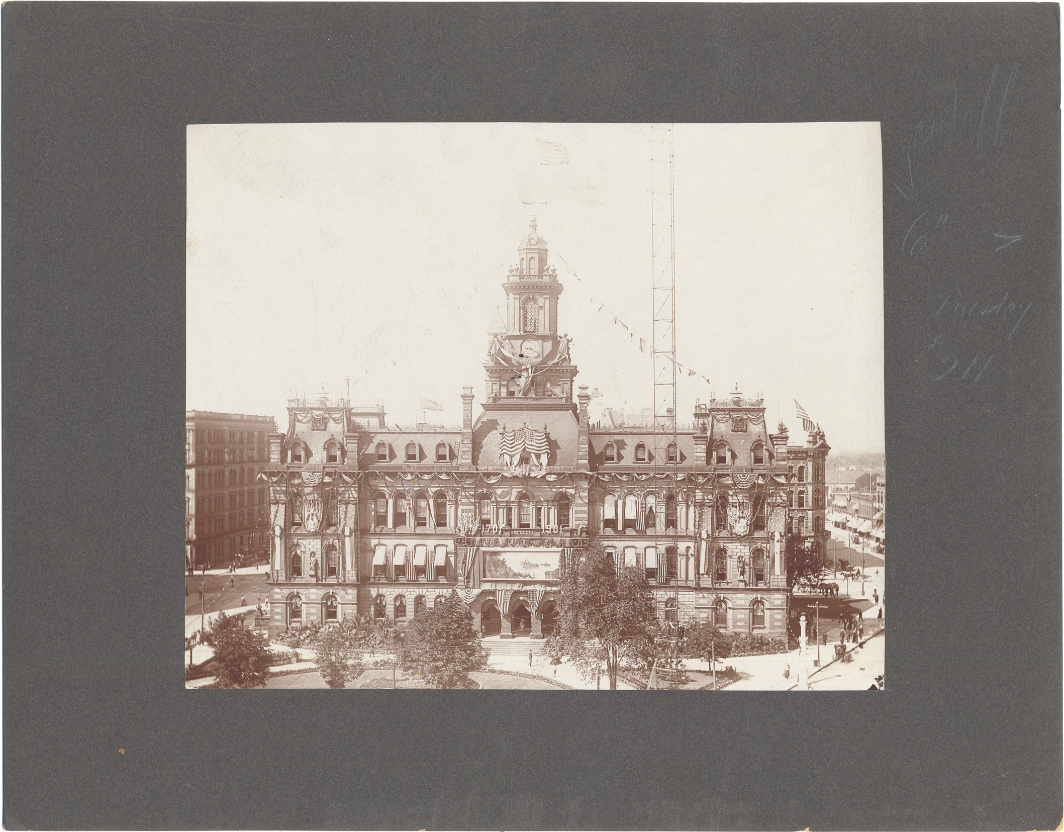 Favorite this☆ City Hall decorated for Bicentenary celebration Description: View of Detroit City Hall decorated with bunting and American flags, commemorating bicentennial of the city of Detroit; large mural over entrance; sign on facade: "1701-1901." Details Resource ID: DPA4728 Subject: Detroit (Mich.)--Centennial celebrations, etc. Photographic prints Date Issued: 1901 Format: 1 photographic print mounted on mat board ; image 7.5 x 9.25 in. Member of: Burton Historical Collection Filing Location: D/Anniversaries-Bi-centenary celebration Rights: Physical rights are retained by DPL. Copyright is retained in accordance with U.S. copyright laws.